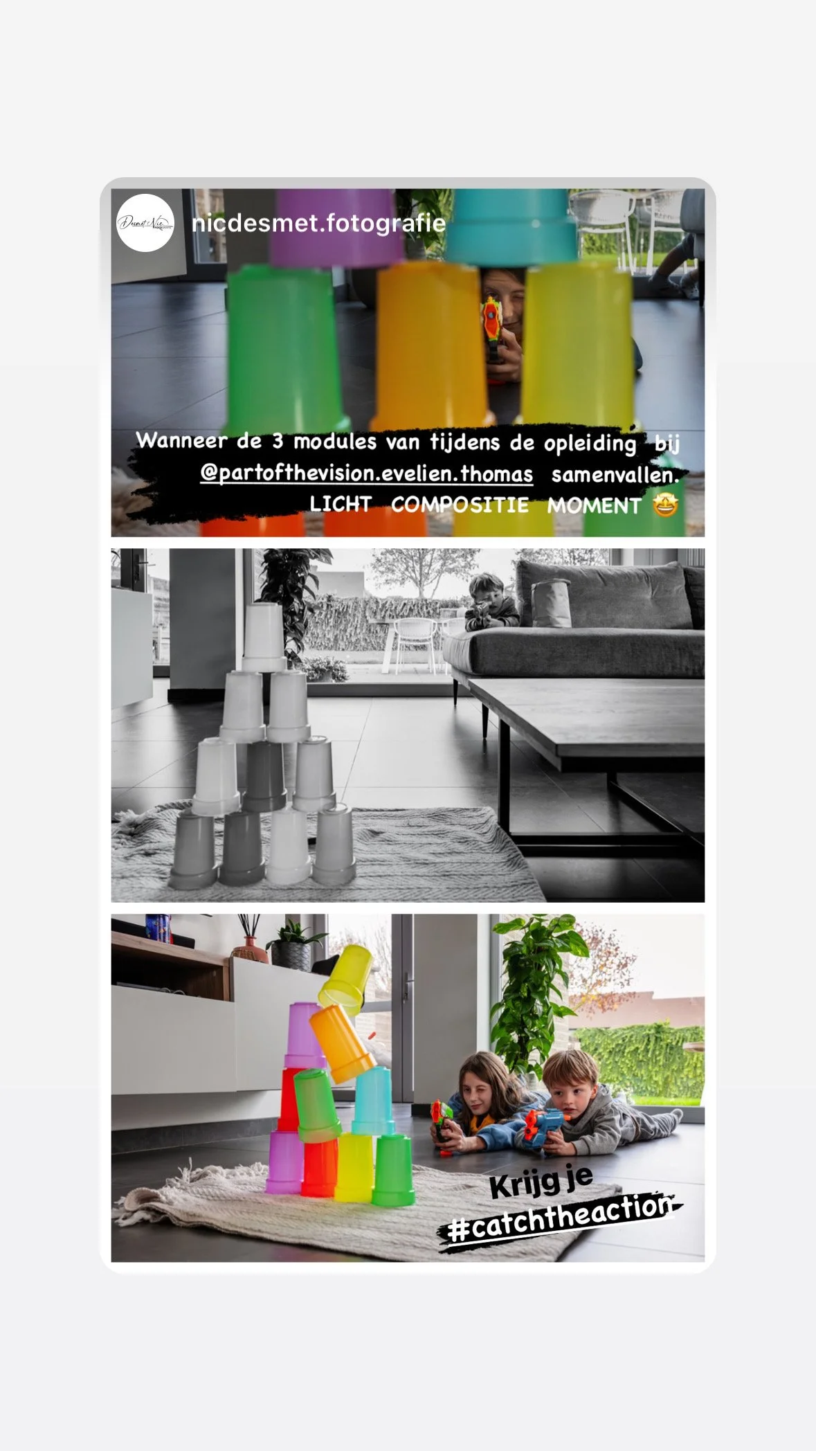 “Ik was gewoon iemand dat maar iets deed. Ik vond het leuk om m'n jongens in beeld te brengen en doordat ik al paar keer aangesproken werd om zeker iets met fotografie te doen, begon het te kriebelen. Maar ik wilde niet zomaar iets beginnen, ik wou investeren om bij te leren maar niet via avondschool (been there done that en vond het noppes) ik had geen zin in lessen geschiedenis maar wel in praktijk en doen. Ik raad deze cursus aan voor mama’s of papa’s die mooie foto’s willen maken van hun kinderen of fotografen die dromen van een bijberoep/hoofdberoep. Degene die de passie hebben voor fotografie maar nog wat moeten sleutelen aan hun zelfzekerheid.”